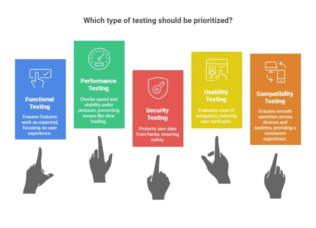Mobile app testing usually focuses on five main areas: functional testing, performance testing, security testing, usability testing, and compatibility testing.